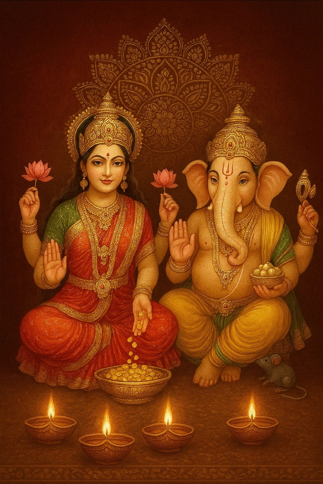 1. मूर्ति स्थापना: – मां लक्ष्मी (धन की देवी) – श्री गणेश (विघ्नहर्ता) – भगवान कुबेर (धन के रक्षक) इनकी मूर्तियाँ या चित्र चौकी पर स्थापित करें।